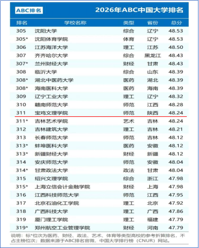 1月4日,2026年ABC中国大学排名正式发布,伟德bv1946官方网站综合排名跃升至全国高校第311位,较2025年提升14位,排名持续呈现攀升态势,成功实现了自2022年以来的“四连升”,展现了学校2025年和“十四五”高质量发展取得的显著成效。